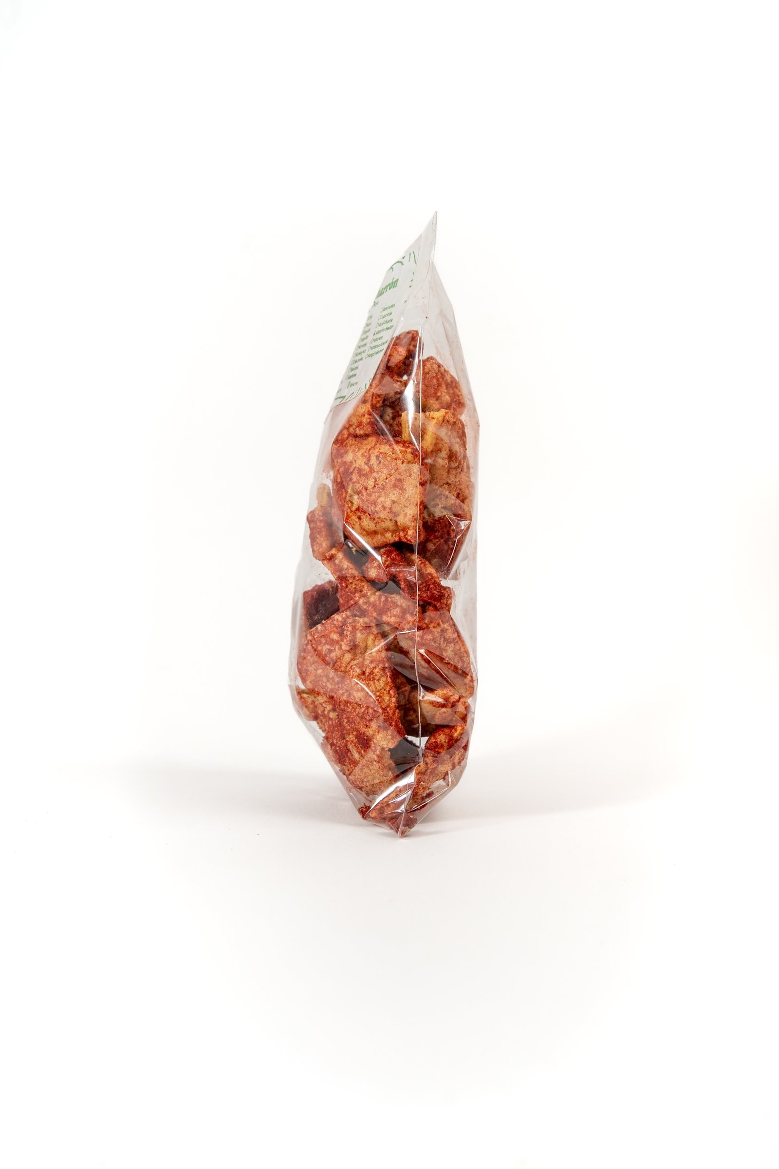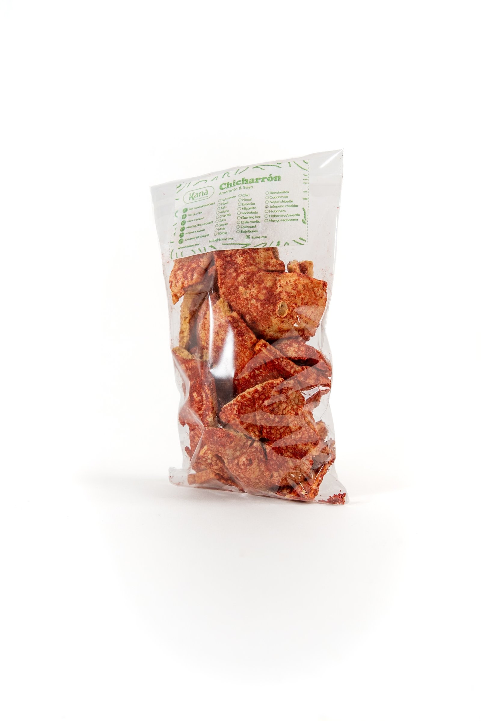 Crujiente y nutritivo chicharrón de amaranto y pasta de soya con sabor a chile morita, una mezcla ahumada y ligeramente dulce que te envuelve con su intensidad. El chile morita, conocido por su sabor profundo y su toque de picante, se fusiona perfectamente con la textura ligera del amaranto y la soya, creando un snack único, lleno de sabor y personalidad. Ideal para veganos y vegetarianos, este chicharrón ofrece una experiencia auténtica con un toque tradicional y un picante moderado.