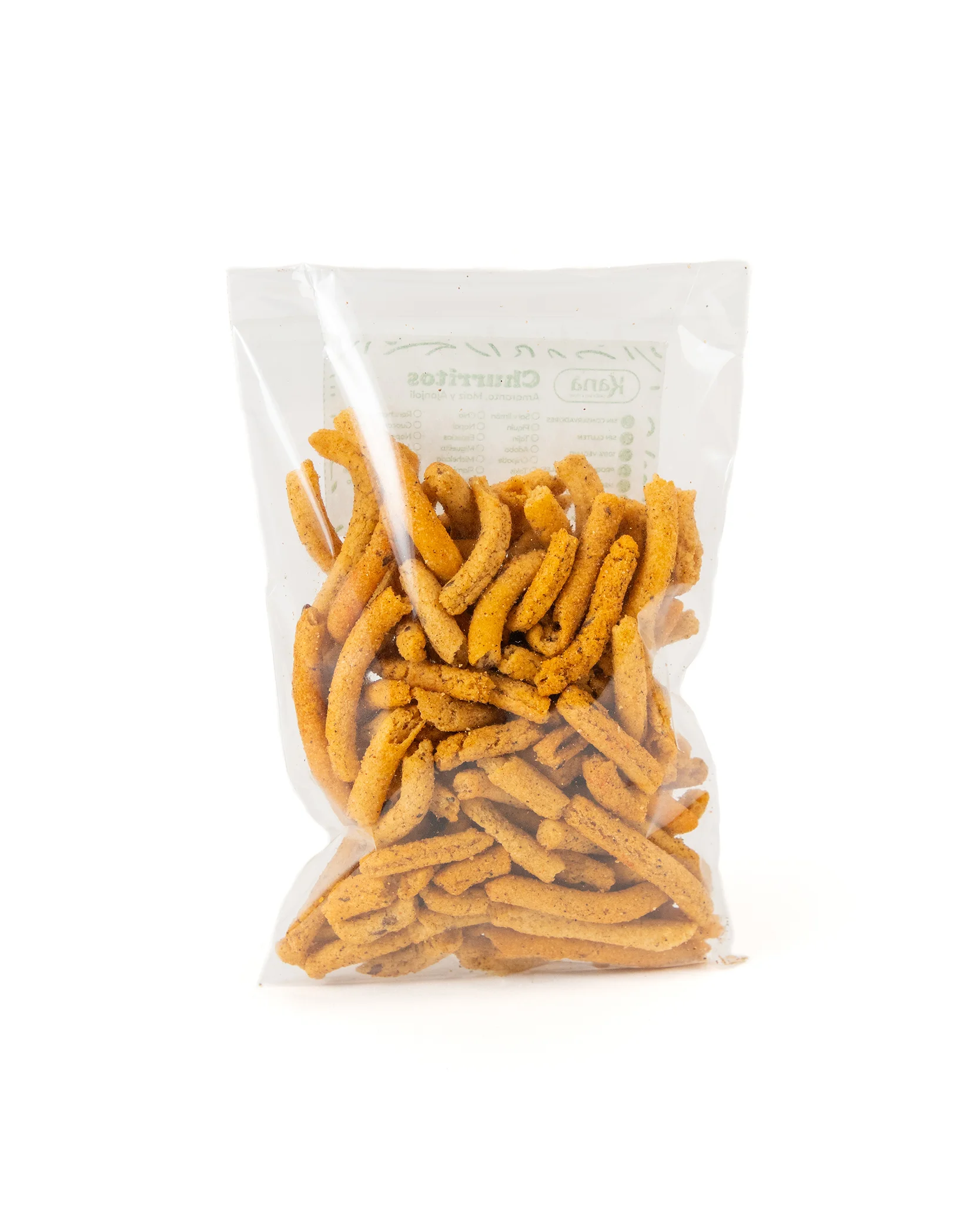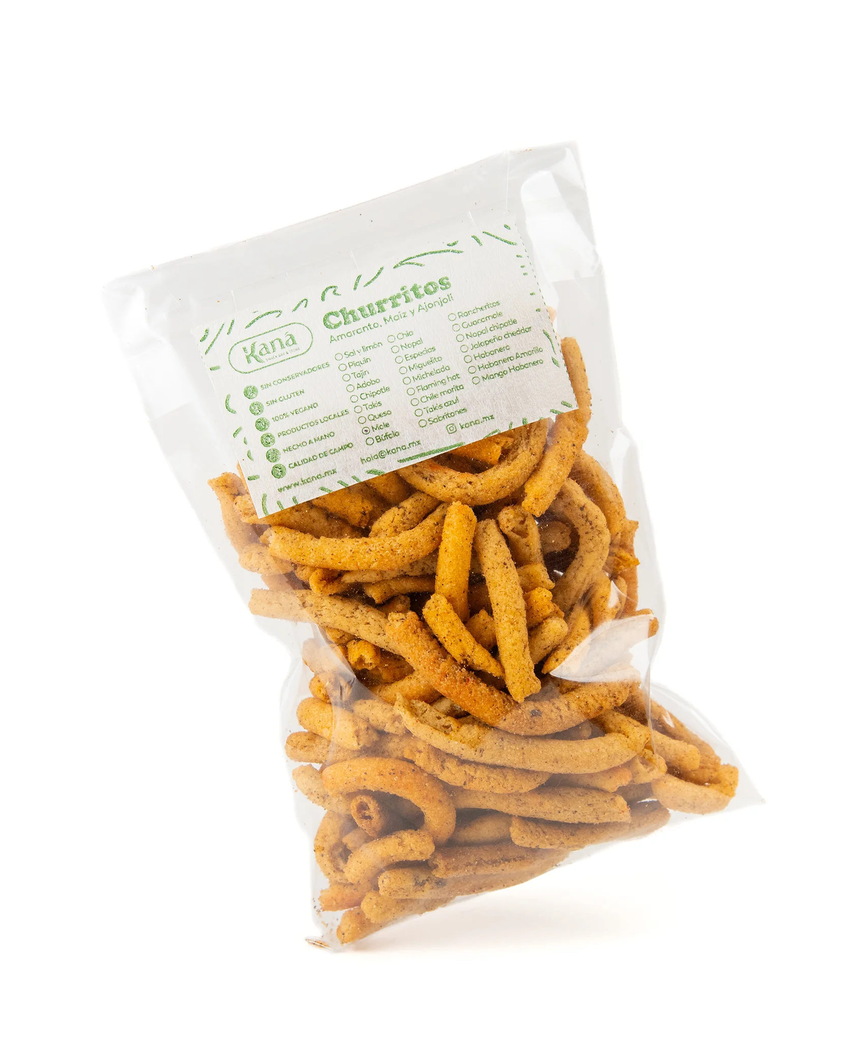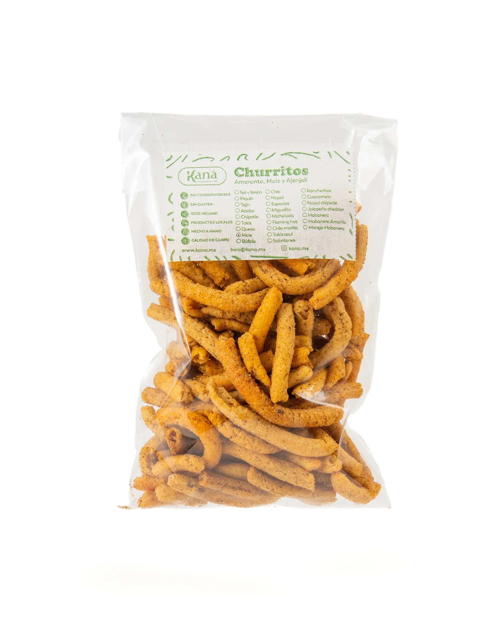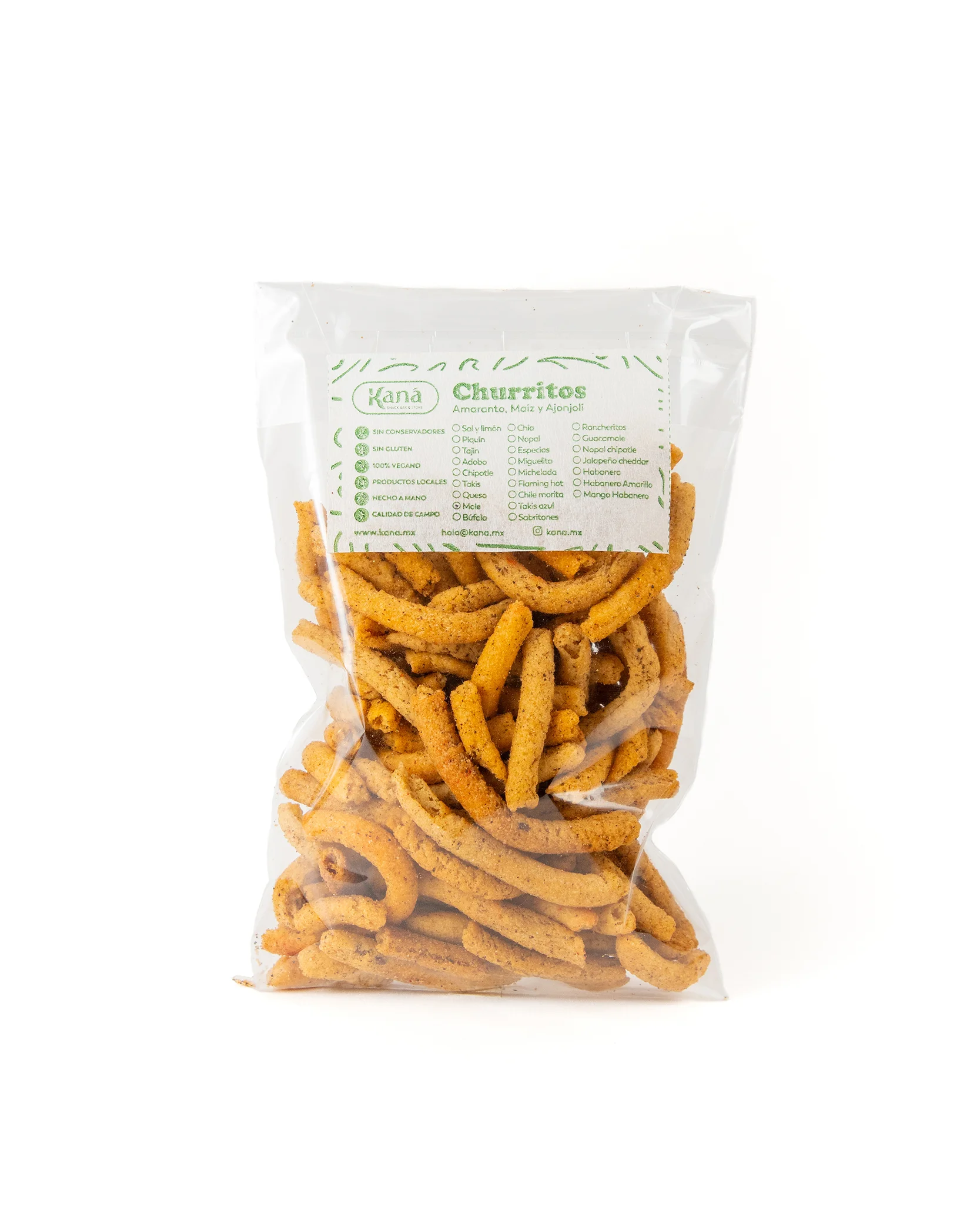 Crujientes y nutritivas tiras fritas de amaranto, maíz y ajonjolí con sabor a mole, una mezcla profunda y rica que combina el dulce, el picante y el ahumado en una danza de sabores. El toque terroso y especiado del mole envuelve cada bocado, creando una experiencia envolvente que celebra la tradición y el sabor auténtico.