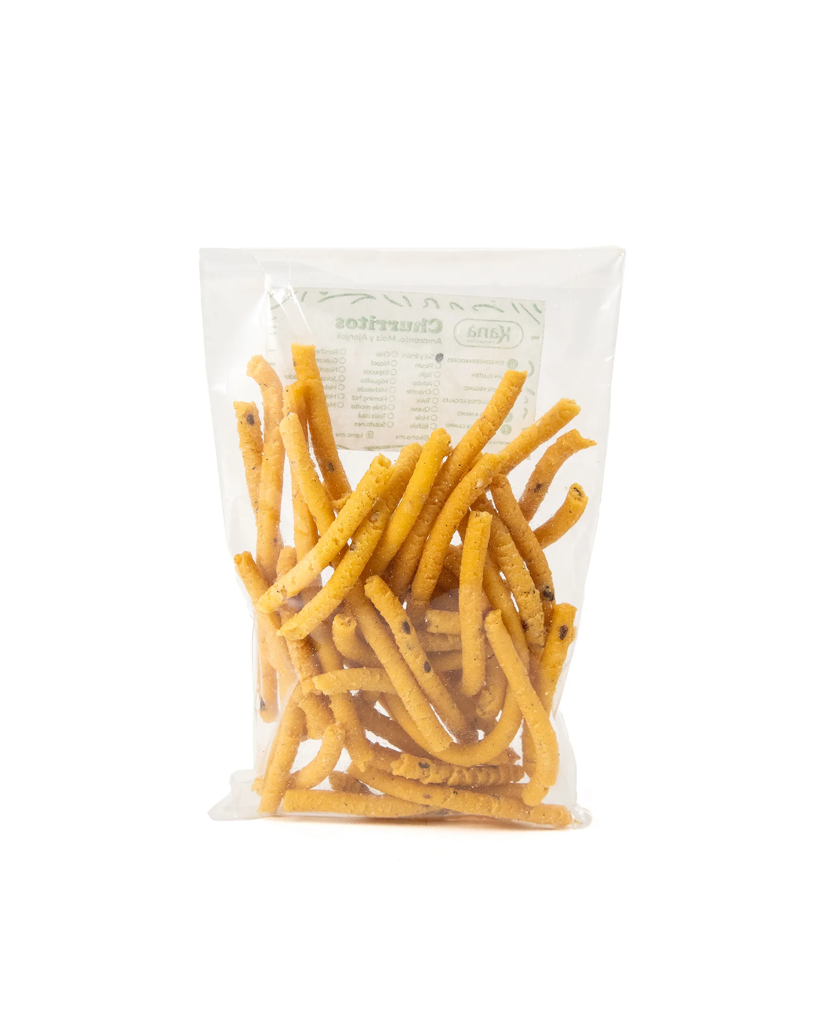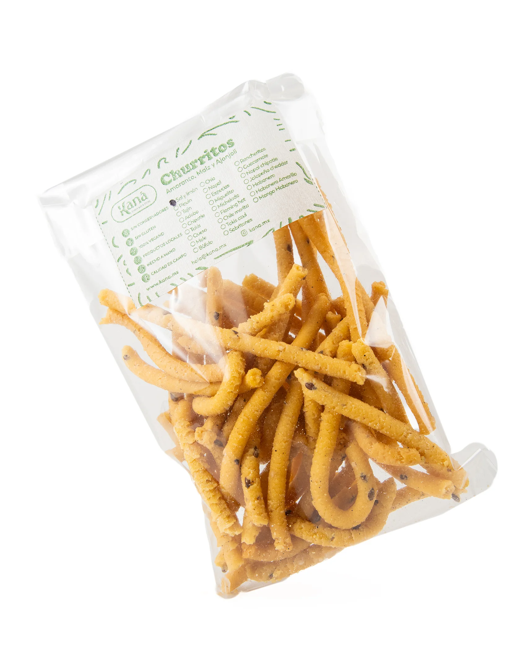 Nuestros churritos de amaranto, maíz y ajonjolí celebran la herencia prehispánica del Valle de México. El amaranto, considerado un “alimento de los dioses” por los mexicas, y el maíz, base de la dieta mesoamericana, se combinan con el ajonjolí para ofrecer una mezcla crujiente, nutritiva y llena de sabor, fusionando tradición y modernidad en cada bocado.